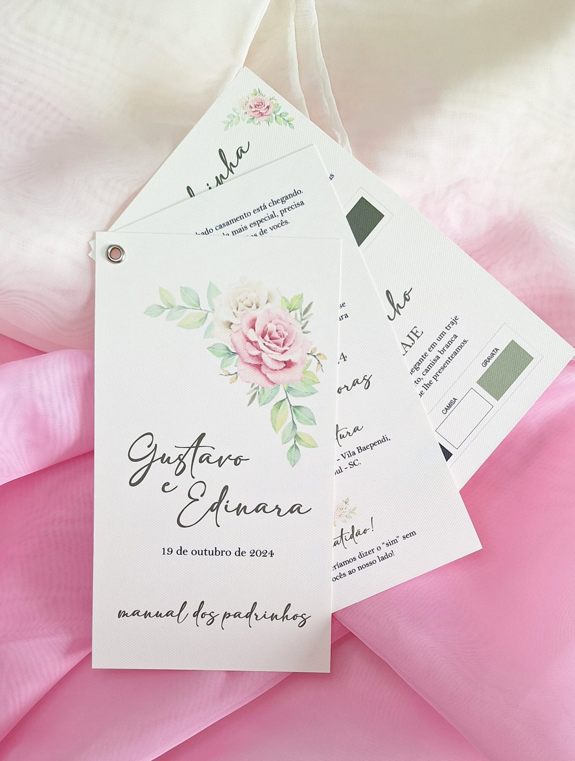 Manual em cards: Guia para padrinhos, com 3 cards, confeccionado no papel de escolha com impressão digital.