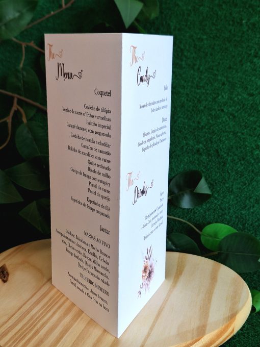 Menu: Menu confeccionado em papel Markatto Opalina 240gr, branco, liso com impressão digital. O menu será enviado com uma fita dupla face para ser montado no local.